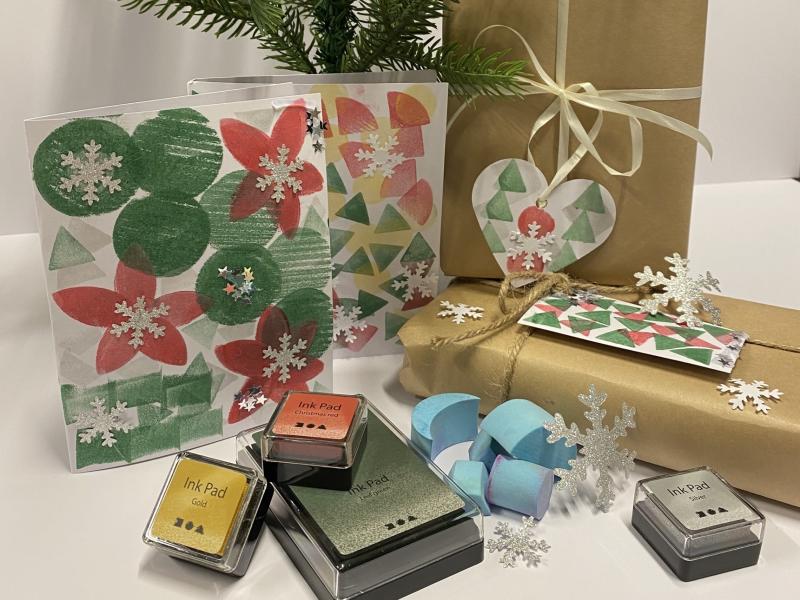 Kig ind på dit lokale bibliotek, når der er personale. På alle bemandede dage indtil 18/12 kan du lave fine julekort og dekorere dem med stempler og glimmer.